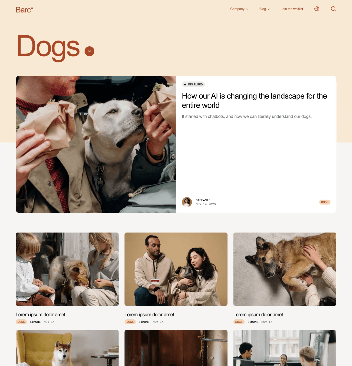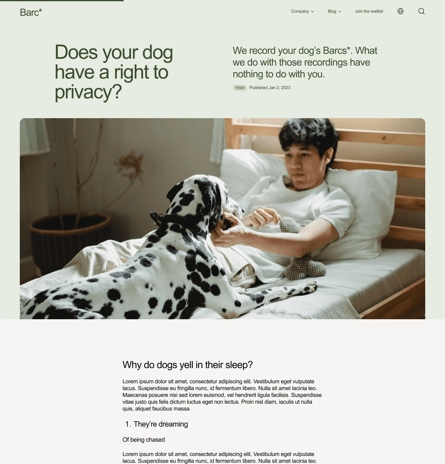 Barc is a product landing page designed to introduce a wearable device that translates a dog’s bark into human language.
